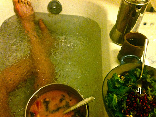 (I take an ice-bath twice a week after I weight lift. They are amazing. You feel fantastic and sleep like a baby afterward. The first second sucks, but the next twenty minutes is bliss. Read a book, drink hot tea, eat warm food, and wear a fuzzy hat. I'm also in the process of inventing a neoprene banana-hammock. Don't steal my idea!!!!)